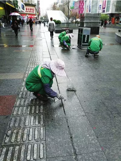 4月6日上午,幾名身著綠色保潔服的城關(guān)物業(yè)保潔員,沿著張掖路步行街一路西行,拿著小鏟子,拎著塑料袋,鏟除地磚上的口香糖。由于口香糖粘黏性強(qiáng),保潔員們有時候得用雙手才能摳掉。然后將鏟除的口香糖裝進(jìn)攜帶的塑料袋里。3名保潔員自新世界百貨門口行至永昌路時,每個人手中已經(jīng)拎了少半袋口香糖了。
