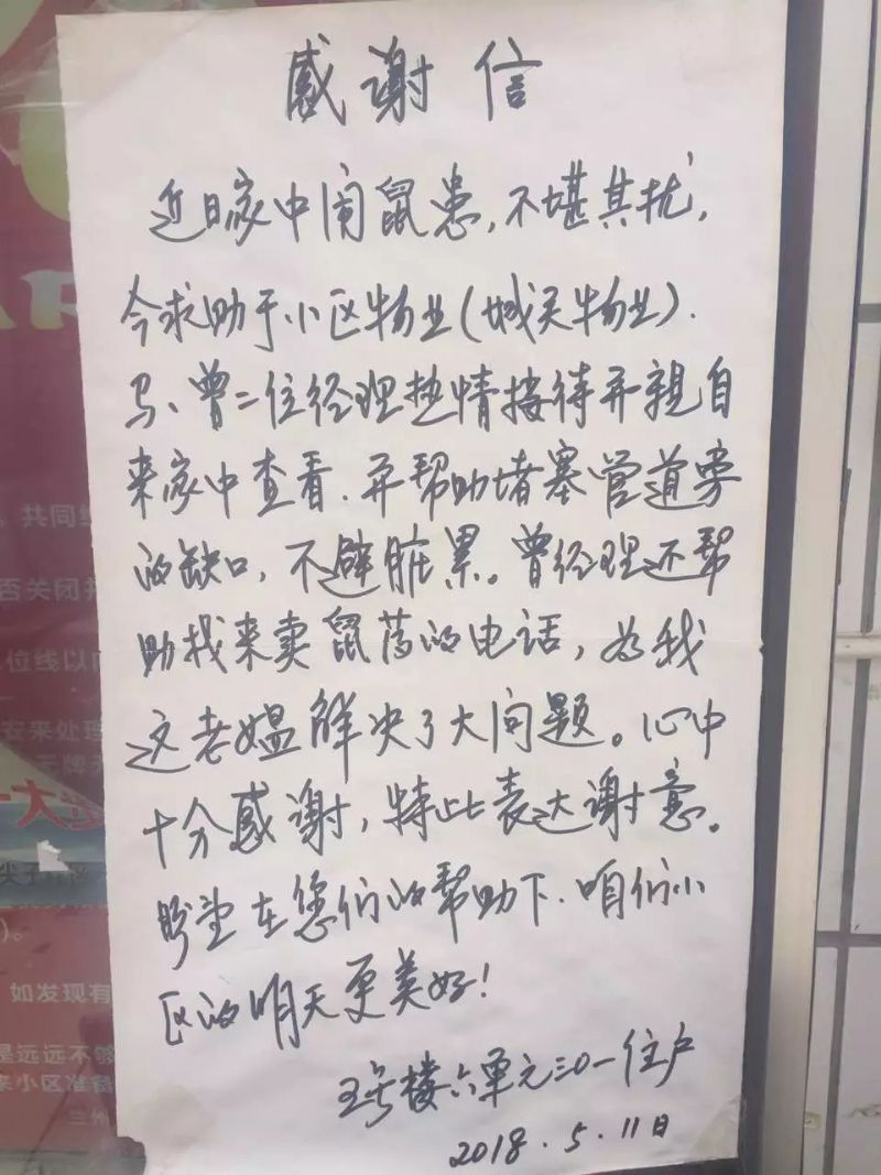 寫來感謝信的是住在五號樓六單元301室的業(yè)主任信,該業(yè)主近來家中鬧鼠患,考慮到自己家在三樓都經(jīng)常受到影響,因此專程前往物業(yè)服務(wù)中心,提醒物業(yè)工作人員加強小區(qū)內(nèi)的滅鼠工作。第三、六事業(yè)部總經(jīng)理助理馬靖、項目副經(jīng)理曾瑾得知該情況后,主動提出前往業(yè)主家中查看。由于該業(yè)主年齡偏大,又常年獨居,馬靖、曾瑾兩位經(jīng)理當(dāng)即決定幫助老人解決鼠患。他們驅(qū)趕了業(yè)主室內(nèi)的老鼠,并通過各種材料將老鼠出入的所有洞口堵住,最后將現(xiàn)場清理干凈。同時幫助老人聯(lián)絡(luò)專業(yè)的滅鼠公司,預(yù)約上門進行專業(yè)清理。