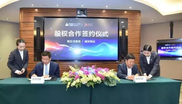 城關(guān)物業(yè)董事長楊民召(右)與雅生活集團(tuán)總裁劉德明(左)簽署股權(quán)合作協(xié)議