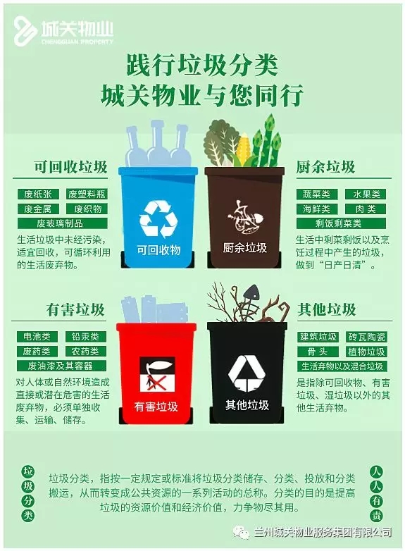 為有效推進(jìn)城關(guān)物業(yè)所轄小區(qū)垃圾分類工作的有序開展,先后在各小區(qū)購置新型四色分類垃圾桶(包括可回收物、易腐垃圾、有害垃圾和其他垃圾),配備垃圾棚,集中打造生活垃圾分類投放點,方便業(yè)主更好地分類投放。
